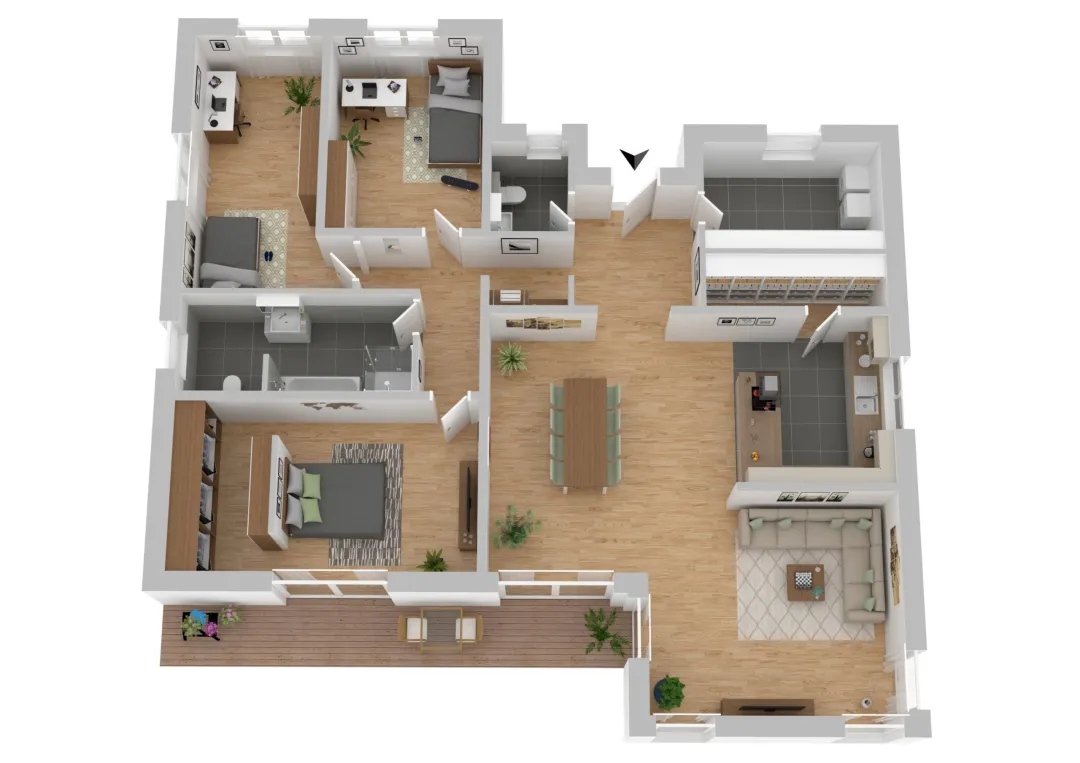 Unser größter Flachdachbungalow ist modern geschnitten und lässt Wohnträume wahr werden. Über den großen und offenen Wohn-, Ess- und Kochbereich gelangt man direkt auf den überdachten Terrassenbereich. Die großen, bodentiefen Fenster sorgen für helle Räume.