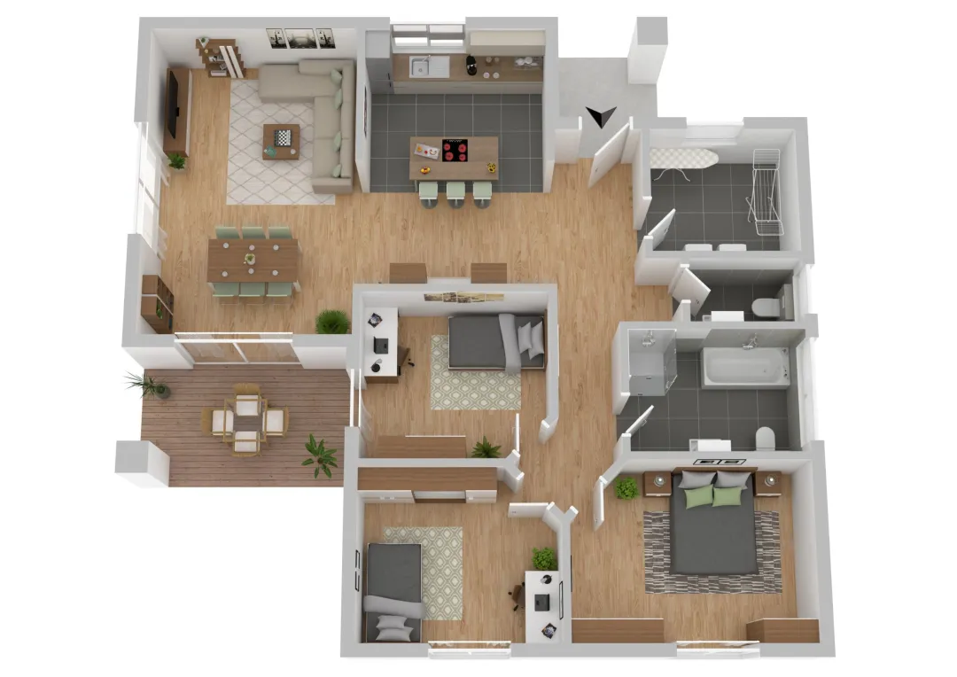 Unser größter Flachdachbungalow ist modern geschnitten und lässt Wohnträume wahr werden. Über den großen und offenen Wohn-, Ess- und Kochbereich gelangt man direkt auf den überdachten Terrassenbereich. Die großen, bodentiefen Fenster sorgen für helle Räume.
