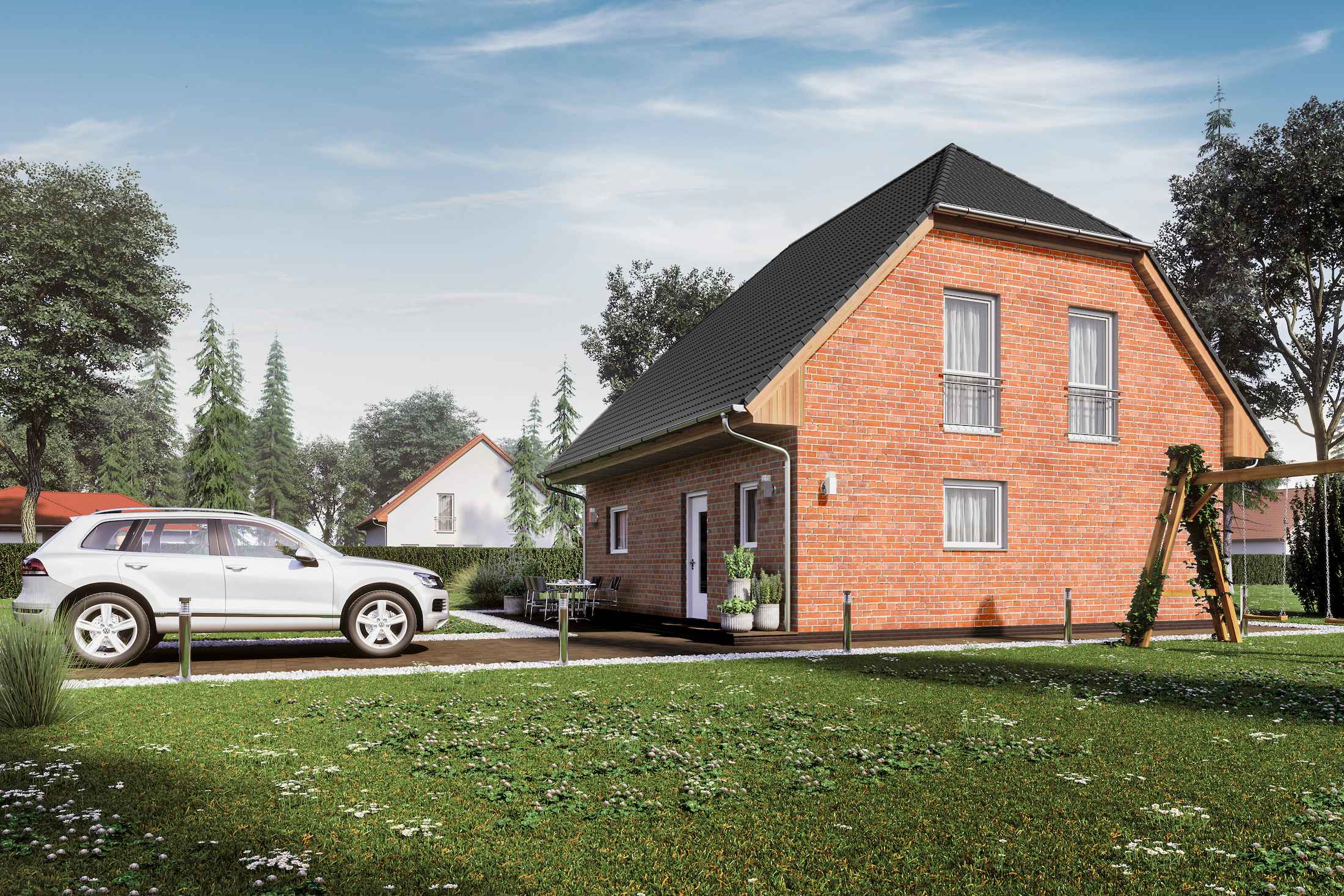 Unser Haus Ilsenburg bekommt durch das Krüppelwalmdach einen ländlichen Charakter, der durch den rötlichen Klinker schön unterstrichen wird. Und auch im Innenbereich sorgt die Dachkonstruktion für eine maximale Ausnutzung der Fläche. Der durch eine schmale Wand getrennte Wohn- und Essbereich sorgt für ausreichende Privatsphäre in beiden Räumen, ohne diese komplett voneinander zu trennen.