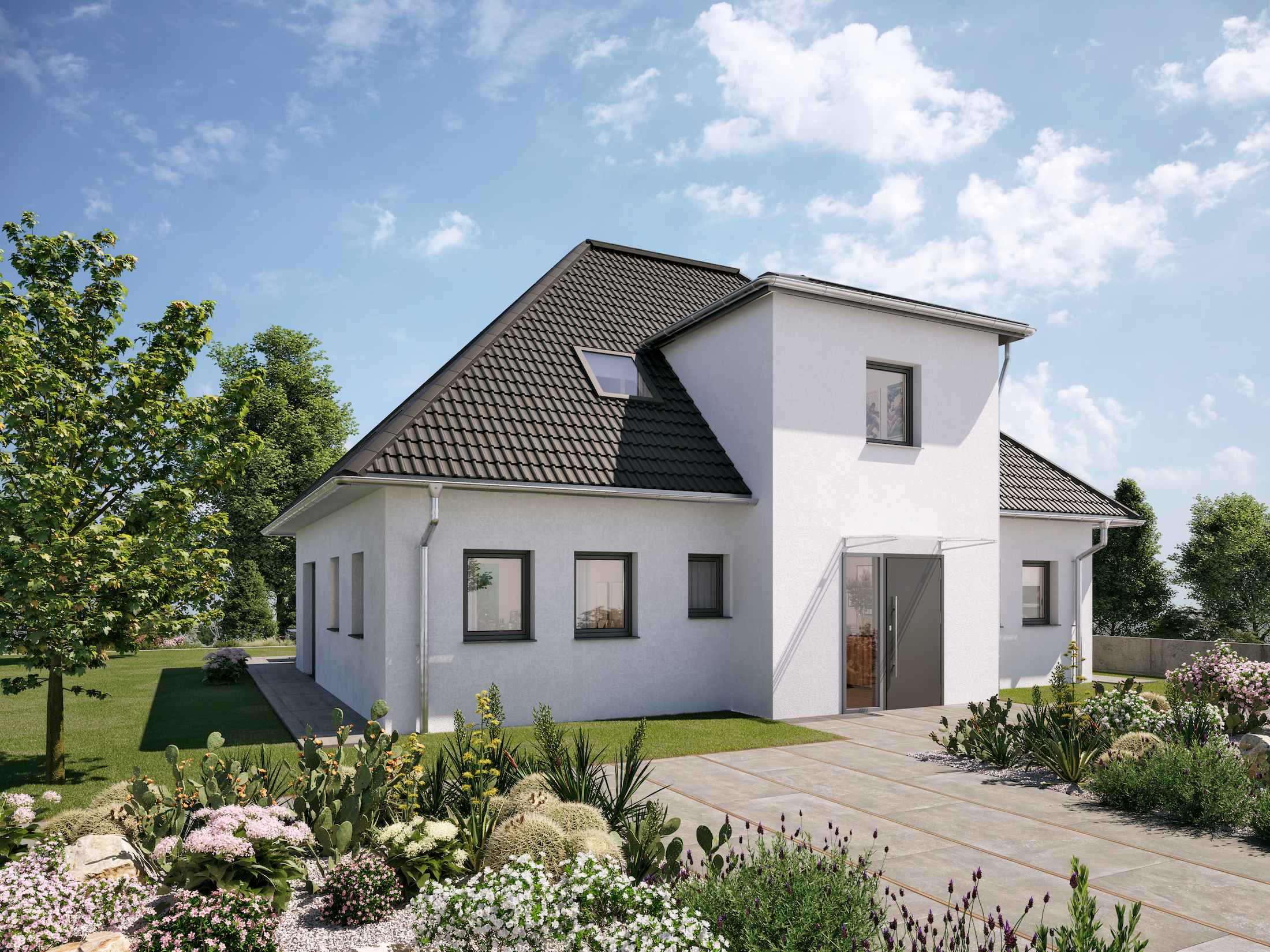 Die Verbindung aus Krüppelwalm- und Walmdach mit verschiedenen Neigungen macht Ihr Traumhaus zum wahren Hingucker. Auch im Innenbereich kann sich Ihr neues Eigenheim sehen lassen, denn bereits die große Diele lädt zum Eintreten ein. Der direkte Weg in das besonders großzügige Wohnzimmer, das mit dem Esszimmer verbunden ist, verdeutlicht die kommunikative und offene Raumplanung.
