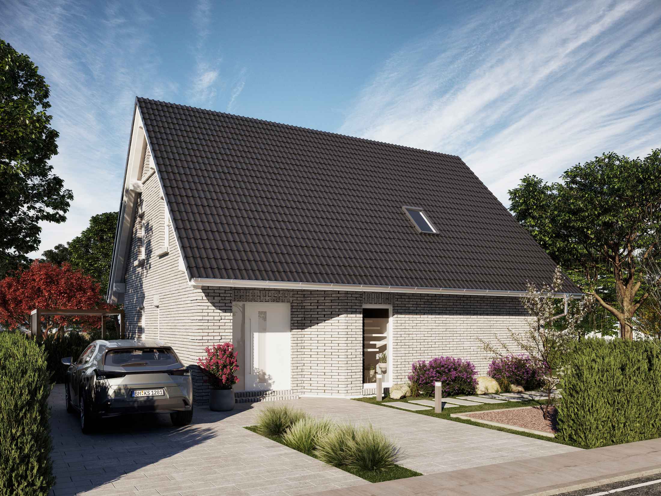 Neben einem Zwerchgiebel, einem Dreiecksfenster im Giebel und einem überdachten Hauseingangsbereich wird eine spannende Raumaufteilung geschaffen, die zum Wohlfühlen einlädt. Der große Wohn- und Essbereich ist durch zwei doppelflügelige Türen mit der Terrasse verbunden und schenkt dem knapp 47 m² großen Raum Helligkeit. Die zwei zusätzlichen Zimmer im Dachgeschoss haben direkten Zugang zum Balkon.