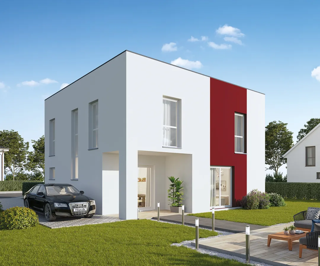 Ein Zusammenspiel aus Wohnkomfort und modernem Wohnen wird in unserer Stadtvilla Dessau wahr. Denn die äußerliche Bauhausoptik sorgt für einen zeitgerechten Charakter des Hauses, der designtechnisch im Innenbereich konsequent fortgesetzt wird. Der teilweise bis zum Dachgeschoss geöffenete Essbereich verleiht durch die Extravaganz einen ganz besonderen Flair. Der überdachte Eingangsbereich bildet mit der ebenfalls überdachten Terrasse ein harmonisches Gesamtbild.