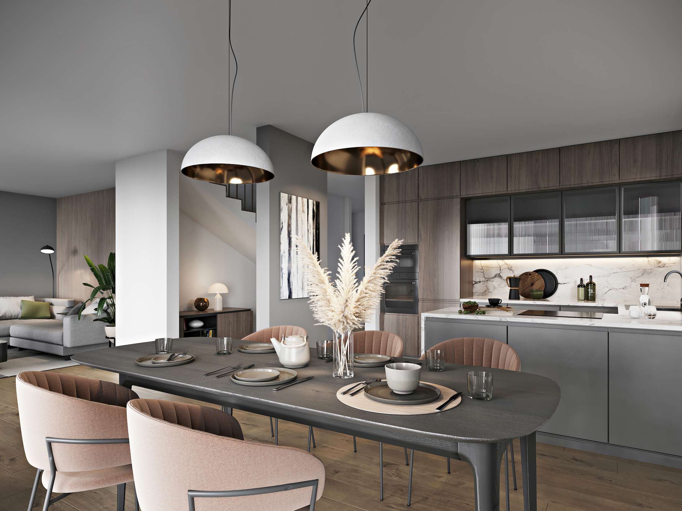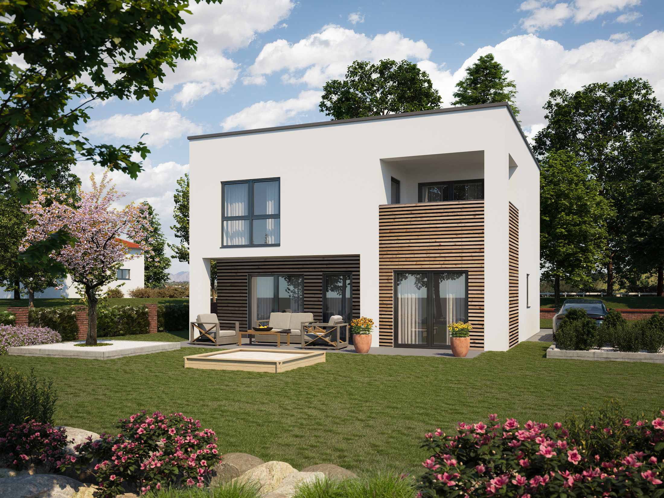 Modern, symmetrisch, schlicht – und trotzdem einfach schön! Beginnend bei einem überdachten Hauseingangsbereich, befindet sich im Erdgeschoss ein großer, ebenfalls überdachter Terrassenbereich. Im Haus wird ein besonderer Fokus auf die Privatsphäre gelegt, denn nicht nur das Gästezimmer oder die beiden Kinderzimmer haben ein angrenzendes Bad, sondern auch das Schlafzimmer kann neben einer integrierten Ankleide auch mit einem eigenen Bad glänzen.