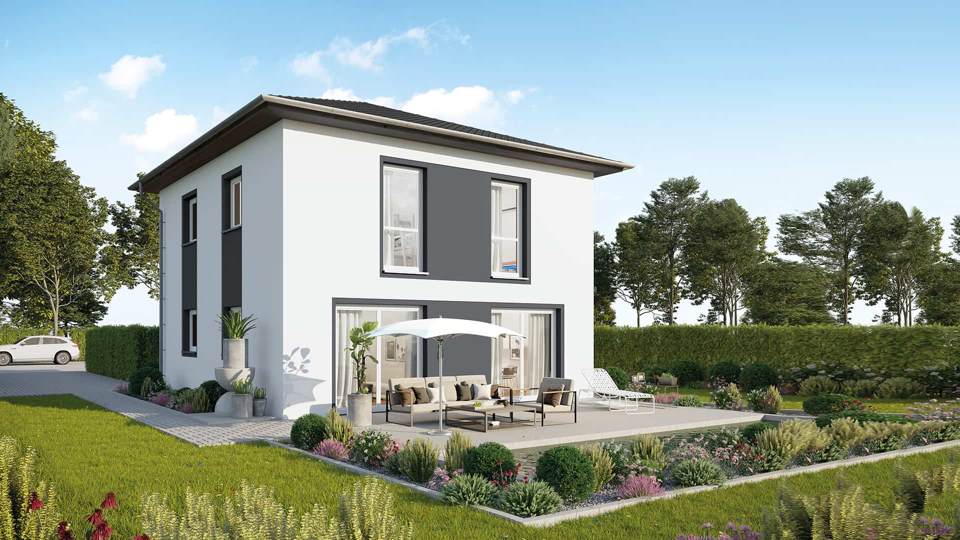 Unser Haus Quedlinburg ist die kleinste Stadtvilla in unserem Produktprogramm und punktet dennoch mit einem kompakten und hellen Grundriss. Die Fläche der zwei Vollgeschosse wird optimal ausgenutzt und trennt die Schlafbereiche im Obergeschoss von den Wohnbereichen im Erdgeschoss.