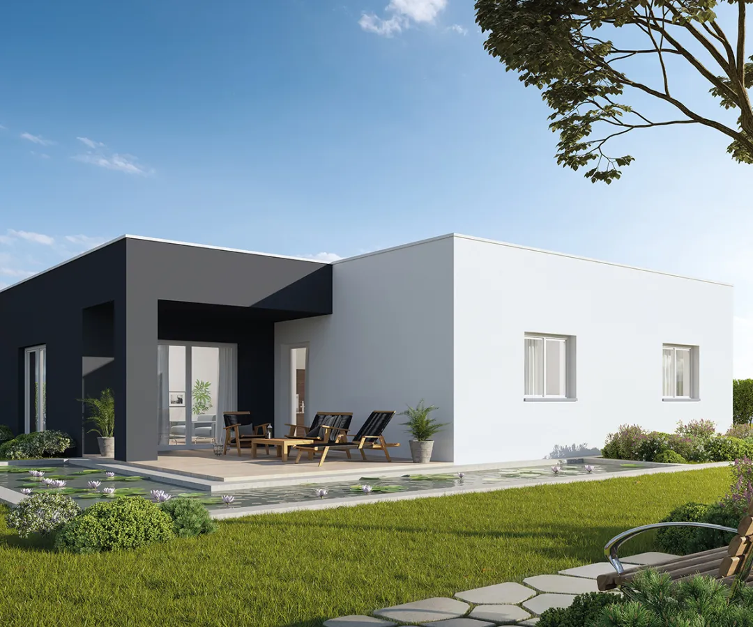 Unser größter Flachdachbungalow ist modern geschnitten und lässt Wohnträume wahr werden. Über den großen und offenen Wohn-, Ess- und Kochbereich gelangt man direkt auf den überdachten Terrassenbereich. Die großen, bodentiefen Fenster sorgen für helle Räume.