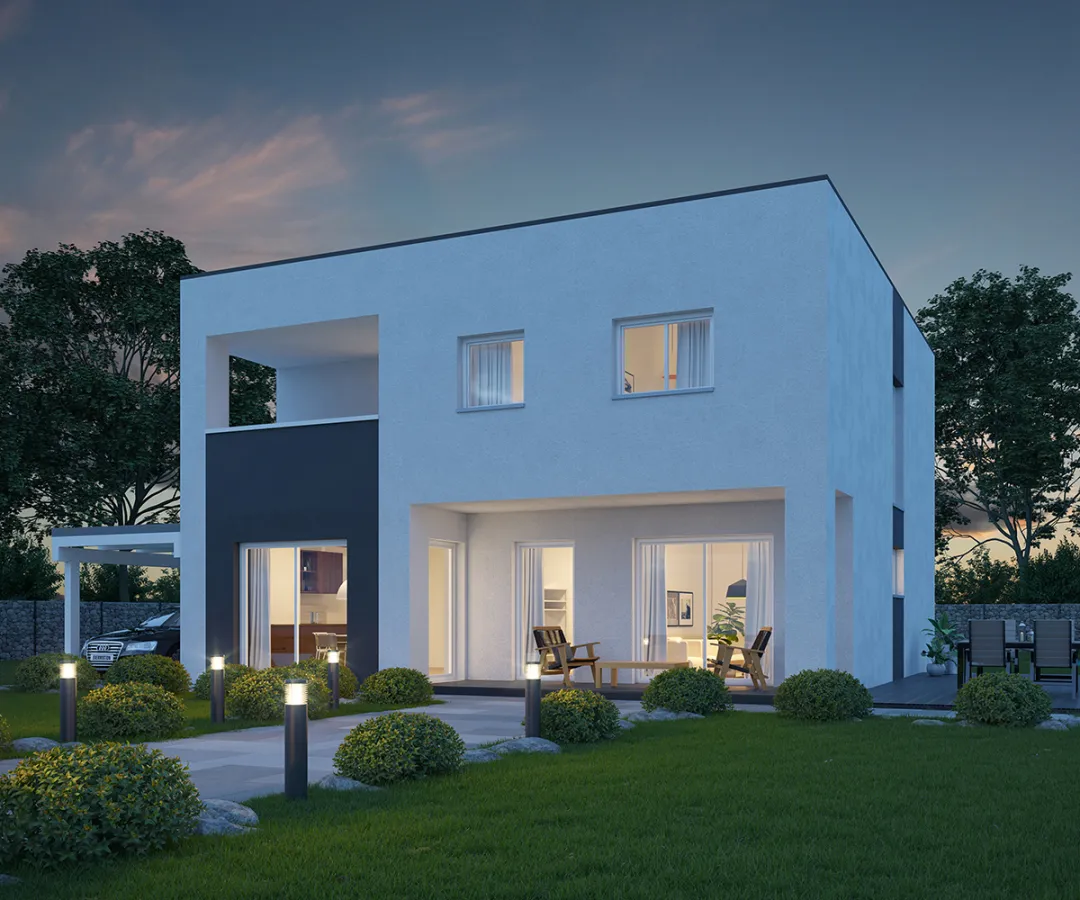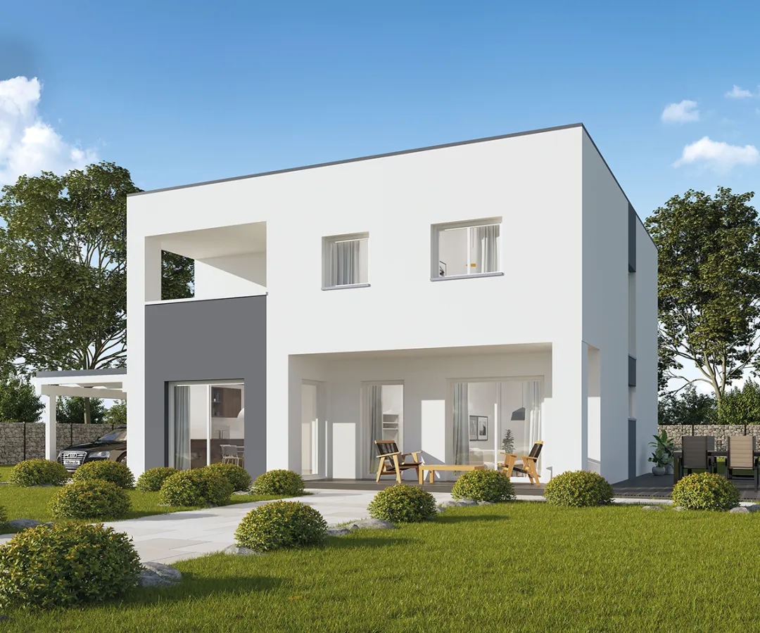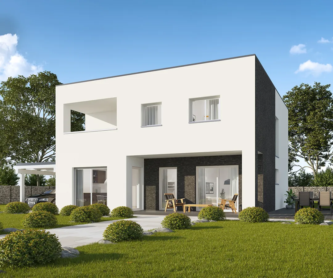 Modern, symmetrisch, schlicht – und trotzdem einfach schön! Beginnend bei einem überdachten Hauseingangsbereich, befindet sich im Erdgeschoss ein großer, ebenfalls überdachter Terrassenbereich. Im Haus wird ein besonderer Fokus auf die Privatsphäre gelegt, denn nicht nur das Gästezimmer oder die beiden Kinderzimmer haben ein angrenzendes Bad, sondern auch das Schlafzimmer kann neben einer integrierten Ankleide auch mit einem eigenen Bad glänzen.